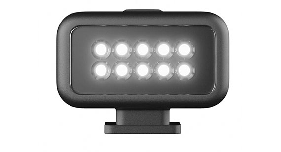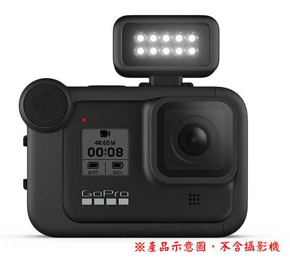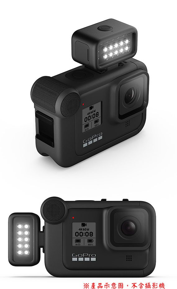 適用:HERO9 Black、HERO8 Black,可透過媒體模組(另購)連接,或搭配固定座作為獨立燈具使用,LED照明拍攝主體,200流明,4種亮度等級,防水性能達10公尺,內建充電電池可達6小時續航力