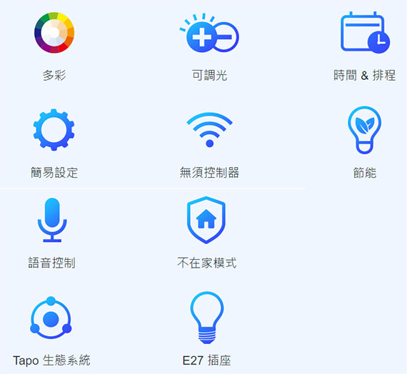 燈頭:E27,功率:8.7W 860流明,電壓:100V~240V,色溫2500~6500K(多色調節16000000種色調可選擇),方便預設,時間排程,日出和日落模式,wifi連接無需控制器,語音控制, Tapo app遠端控制,不在家模式