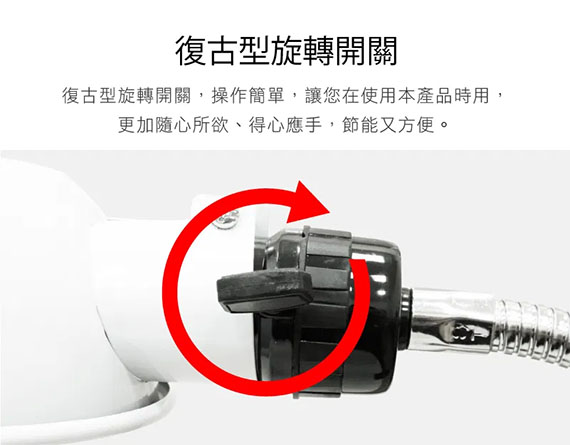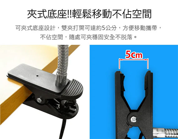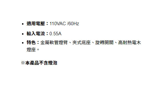 輸入電流:0.55A,電壓:110VAC/60Hz,雙夾打開5公分,適用:E27 白熾燈泡 MAX60W,E27 螺旋燈泡 MAX20W,E27 LED燈泡 MAX10W,金屬軟管燈臂,夾式底座,旋轉開關,高耐熱電木燈座