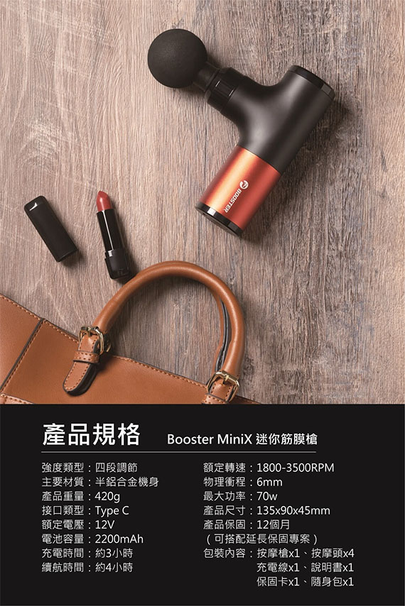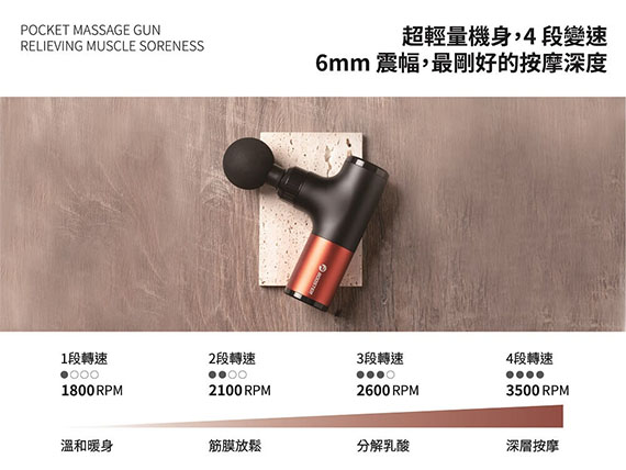 4段變速,額定轉速:1800-3500RPM,物理衝程:6mm,最大功率70W,電池容量:2200mAh,充電時間:約3小時,續航時間:約4小時,接口:Type C,重量只有420g,機身大小可比iphone X,消除肌肉僵硬,緩解肌肉痠痛,活絡氣血循環,小巧機身,時尚配色,尺寸:135x90x45mm,保固12個月