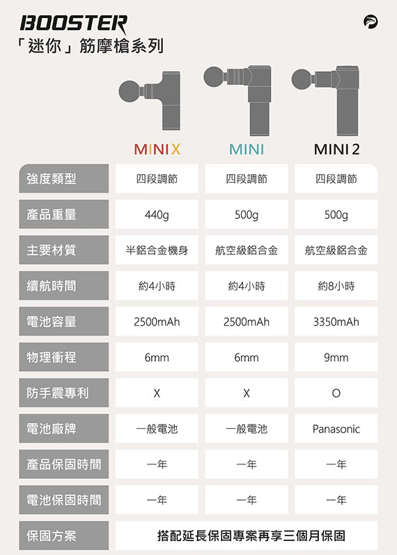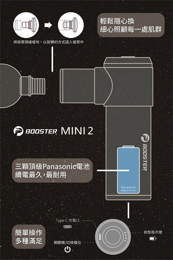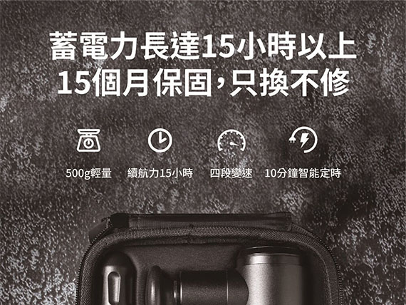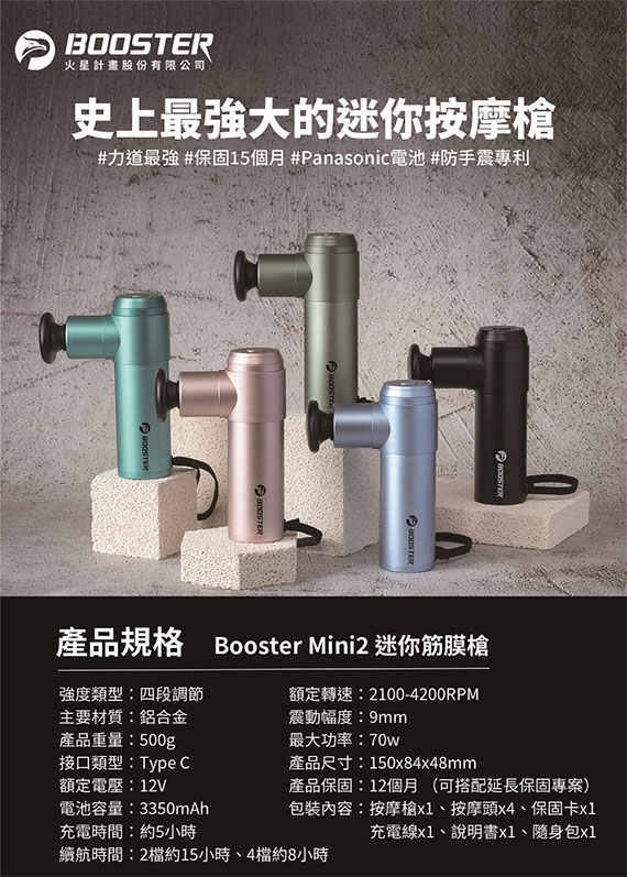 4段變速,額定轉速:2100-4200RPM,震動幅度:9mm,最大功率70W,電池容量:3350mAh,充電時間:約5小時,續航時間:2檔約15小時,4檔約8小時,接口:Type C,Booster獨特防手震專利,不遜色大款按摩槍的強力馬達,全鋁合金材質,採用Panasonic電池,尺寸:150x84x48mm,保固12個月