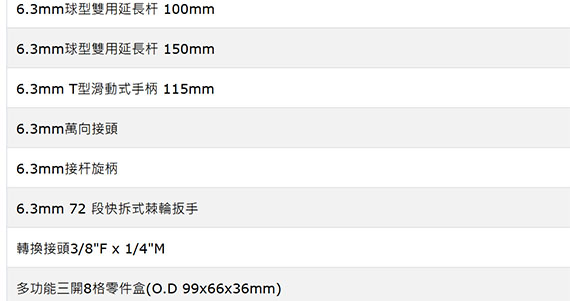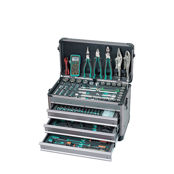 精選專業的124件套筒工具組、搭配有齊全的6.3-12.5mm套筒組合、72齒快拆棘輪扳手、T型滑軌式手柄、延長杆及萬向接頭、表面5u精工電鍍、堅固耐用的三層抽屜櫃、專業汽車保養及DIY的愛好者不可或缺的工具組套