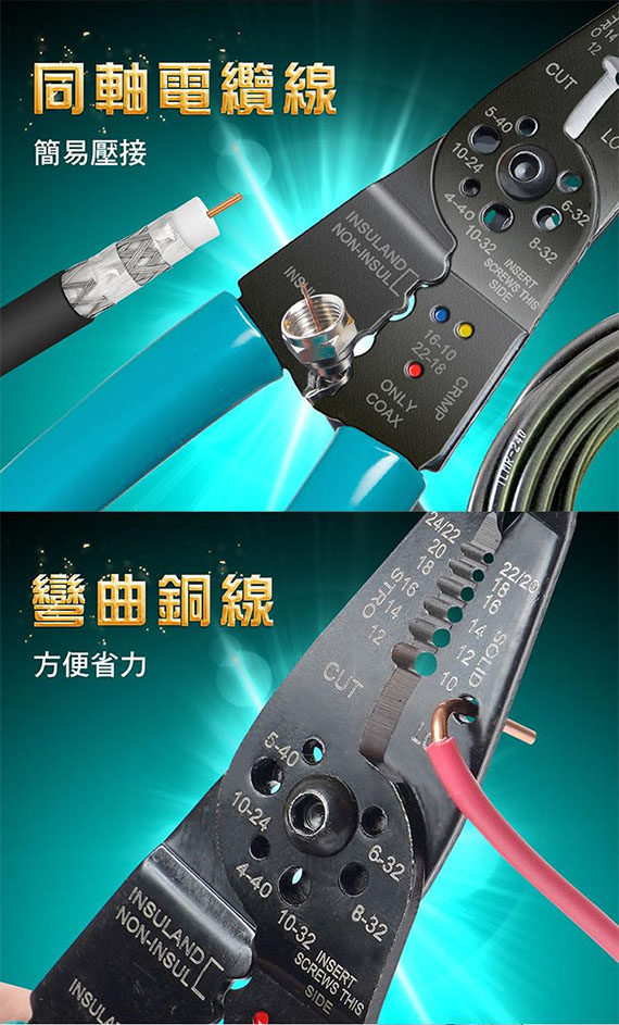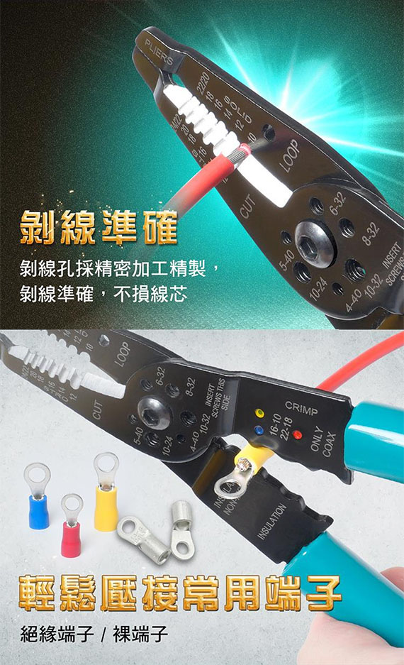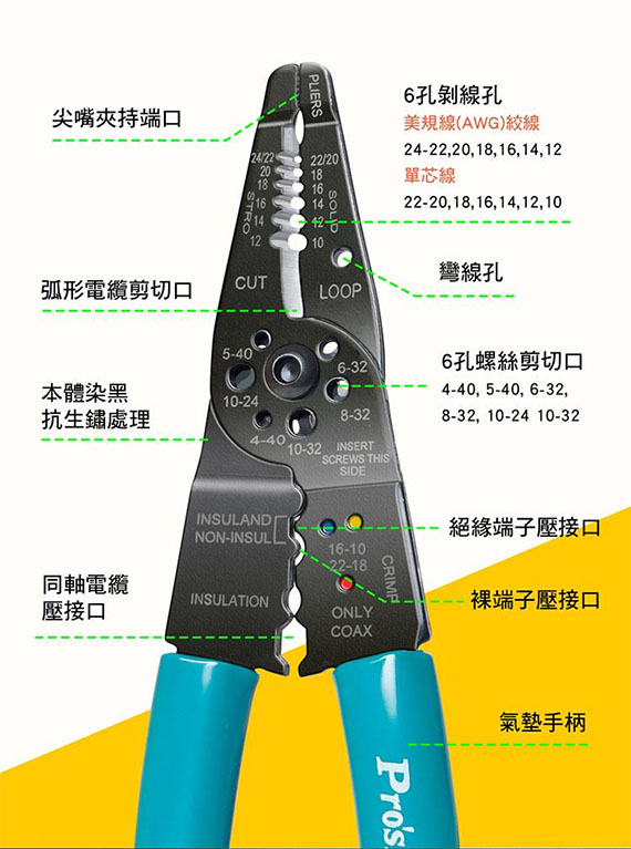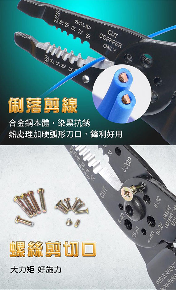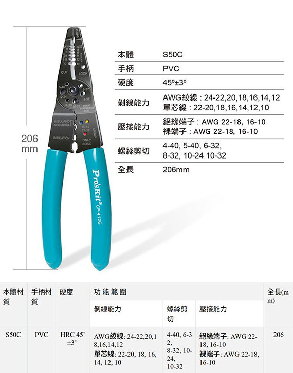 夾持/剪線/剝線/壓端子/剪螺絲/多功能五合一,剝線範圍:AWG絞線:24-22,20,18,16,14,12,單芯線:22-20,18,16,14,12,10, 剪切範圍:4-40, 5-40, 6-32, 8-32, 10-24, 10-32,壓接範圍:絕緣端子:AWG 22-18, 16-10,全長206mm裸端子:AWG 22-18, 16-10,