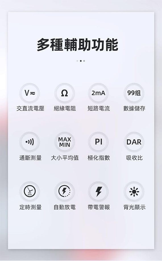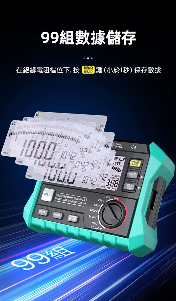 交直流電壓測量、絕緣電阻測量、自動計算PI/DAR、具備高達2500V測試電壓、200GΩ量測範圍、支援資料儲存與背光顯示、符合IEC 61010-1 CAT III 1000V國際安全規範、適用於工業、電力與高階維修應用