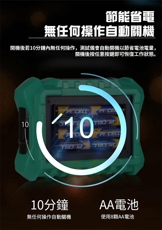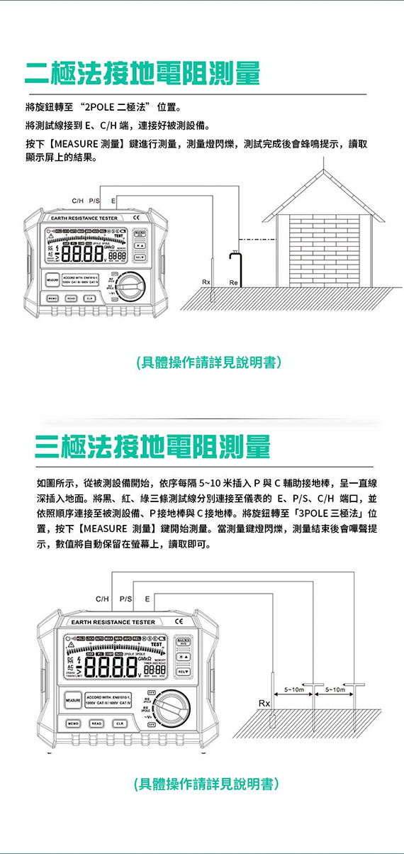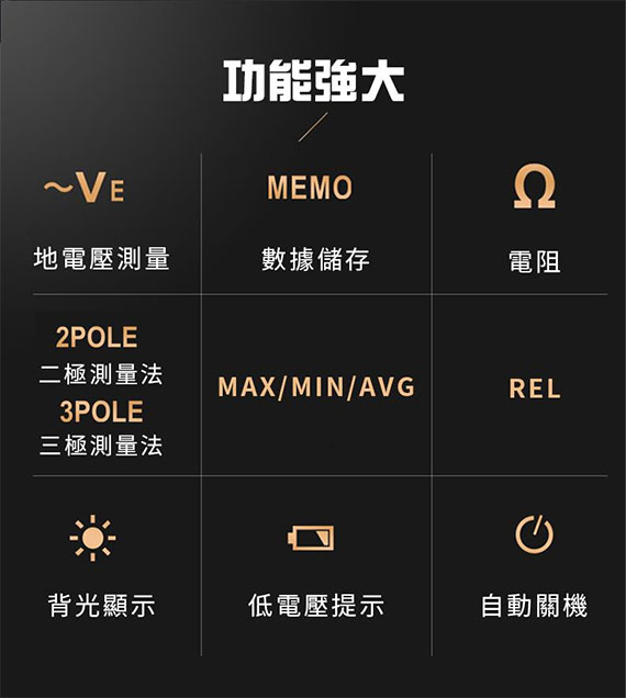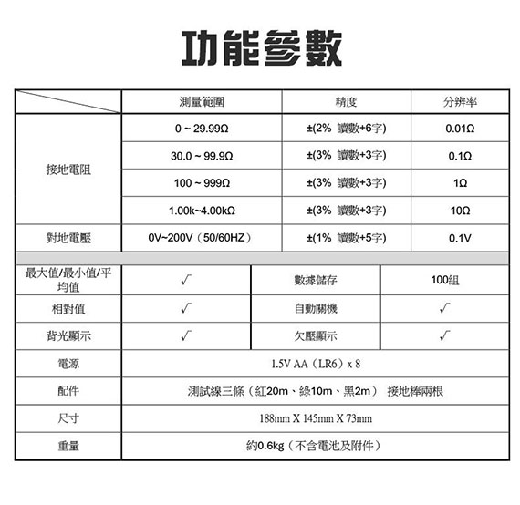 接地電阻二極法/三極法測量、對地電壓測量、最大/最小/平均值測量、100組資料儲存、測量幹擾電壓、測量不同設備的接地電阻(如高壓鐵塔、大樓、電氣工程接地系統、移動通訊基地台、高頻發射器等)、適用於各種電力配電線,室內配線,電氣設備,防雷設備等的接地電阻測試
