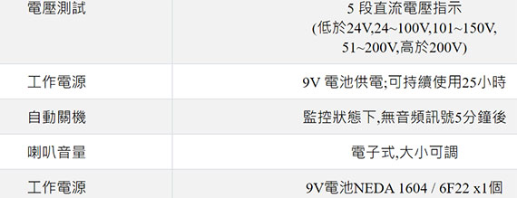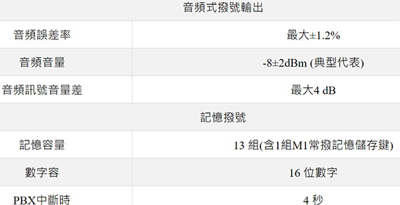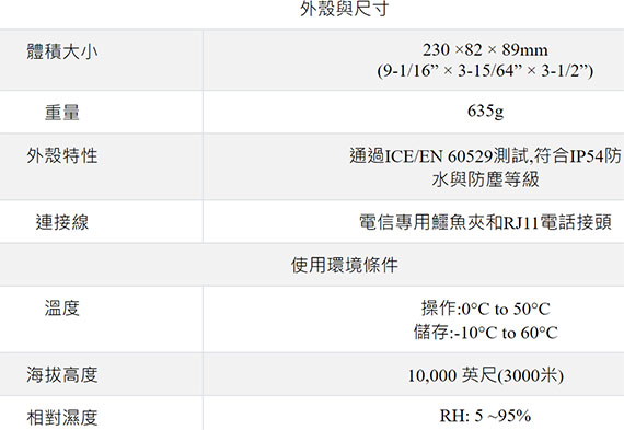 通過IEC/EN60529國際外殼機構保護等級IP54防水、防塵測試、具拋落保護的堅固外殼、通過CE安規認證、高阻抗監聽電路、電話線電壓測試、電話線通斷檢測、線路極性LED顯示、免持/手持雙向通話、音頻/脈衝撥號、末碼重撥功能、PBX暫停功能、靜音控制開關、無段電子音量控制、自動關機功能、低電壓指示燈、悅耳的鈴聲、堅固耐用可拆卸的大型掛鉤