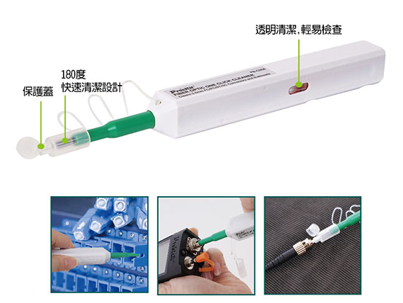2.5 mm FC/PC,ST及SC光纖接頭、使用乾式清潔布取代溶劑需求、具延長桿設計、一按式設計、180度快速清潔設計、透明視窗