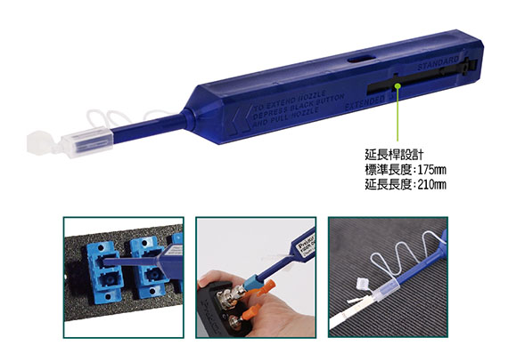 1.25 mm LC光纖接頭、使用乾式清潔布取代溶劑需求、具延長桿設計、一按式設計、180度快速清潔設計、透明視窗