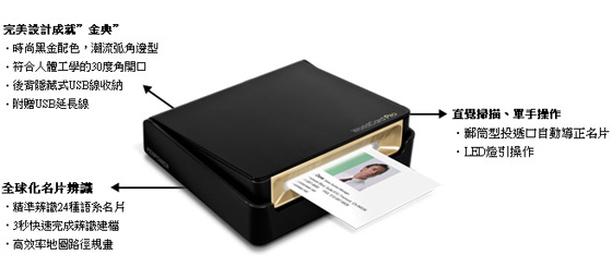 USB 2.0介面,A8彩色名片機,解析度:600dpi,採用萬國碼(Unicode)標準,24種語系名片辨識結合iPhone/iPod,數位化管理多重分類管理最直覺,關鍵字快速搜尋,網站和地圖連結,電子郵件直接傳送,能與Mac通訊錄進行資料交換/匯出,Gmail連絡人同步,直覺式名片瀏覽,機身無按鍵設計,Mac烤漆質感,支援Win/Mac
