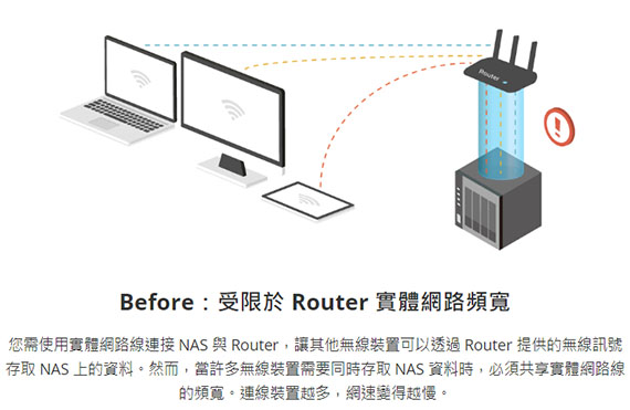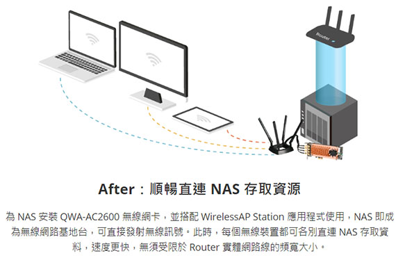 當家人或同事的無線裝置同時連上 Router 存取 NAS 檔案時,多人使用造成網速頓時變慢的無奈感,真的很讓人搥心肝!現在,您只要將 QWA-AC2600 無線網卡安裝於 QNAP NAS 的 PCIe 擴充槽,搭配 WirelessAP Station 應用程式使用,NAS 隨即成為四通八達的無線網路存取點,多個裝置皆可同時直連 NAS,享有直達車般的超快感。