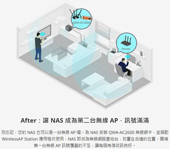將 NAS 安裝 QWA-AC2600 無線網卡,化身為家中第二台無線 AP,可提供 2.4 GHz / 5 GHz 雙頻無線連線,搭配 4 支 5 dBi 可拆卸式全向性高增益天線,讓無線網路涵蓋範圍更廣,訊號更佳。無論在家中或辦公室內任何角落,每個人皆可透過電腦或手機等裝置存取 NAS 中資源,輕鬆享有自由、便利的數位家庭和數位辦公室體驗。