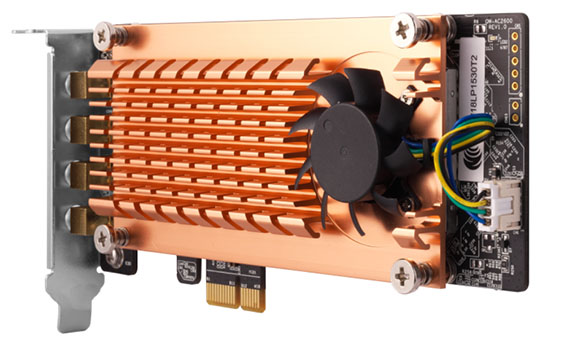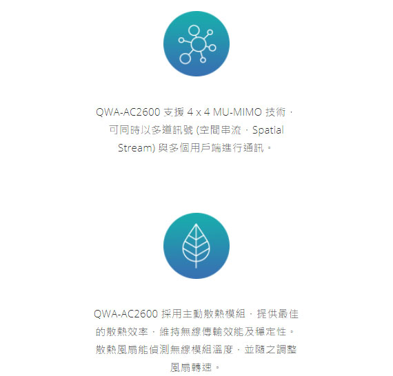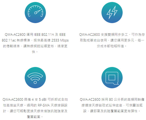 QWA-AC2600 為一 2.4/5 GHz 雙頻同步多工 (Dual Band Dual Concurrent, DBDC) 4 x 4 MU-MIMO 無線網路擴充卡,採用半高式 PCI Express (PCIe) 2.0 x1 介面,搭載 2 組 Qualcomm QCA9984 網路介面控制器 (Network Interface Controller, NIC),最高傳輸速率可達 2533 Mbps (IEEE 802.11n (2.4 GHz) 之 800 Mbps 及 IEEE 802.11ac (5 GHz) 之 1733 Mbps 的總和)。QWA-AC2600 結合 Ubuntu/Linux PC 或 QNAP NAS 可作為存取點或基地台使用,具備 802.11n 的高相容性及 802.11ac 的高速傳輸,可供多種環境使用,例如辦公場所的無線網路、物聯網 (Internet of Things, IoT) 及視訊監控等應用情境。
