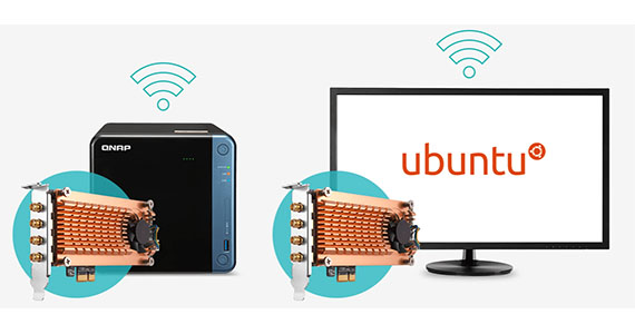 QWA-AC2600 可讓您的 Ubuntu*/Linux PC 或 QNAP NAS 作為無線存取點/基地台使用,讓無線裝置直接存取資料,有效降低主要無線基地台的負載。QWA-AC2600 具備 2.4/5 GHz** 雙頻同步多工設計,可以配置雙無線網路以提升效能。單一 Ubuntu/Linux PC 或 QNAP NAS 可安裝 2 組或更多的 QWA-AC2600,進行更有彈性的配置及效能擴充,以建立安全、私人、高效率的無線網路應用情境。