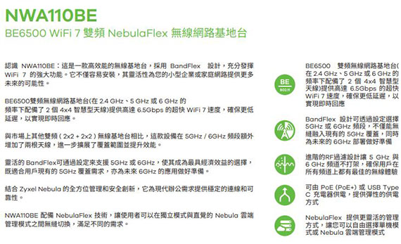 ZYXEL兆勤合勤 NWA110BE BE6500 雙頻 Wi-Fi7 PoE NebulaFlex 無線網路基地台(限量 促銷價至 10/31 止)