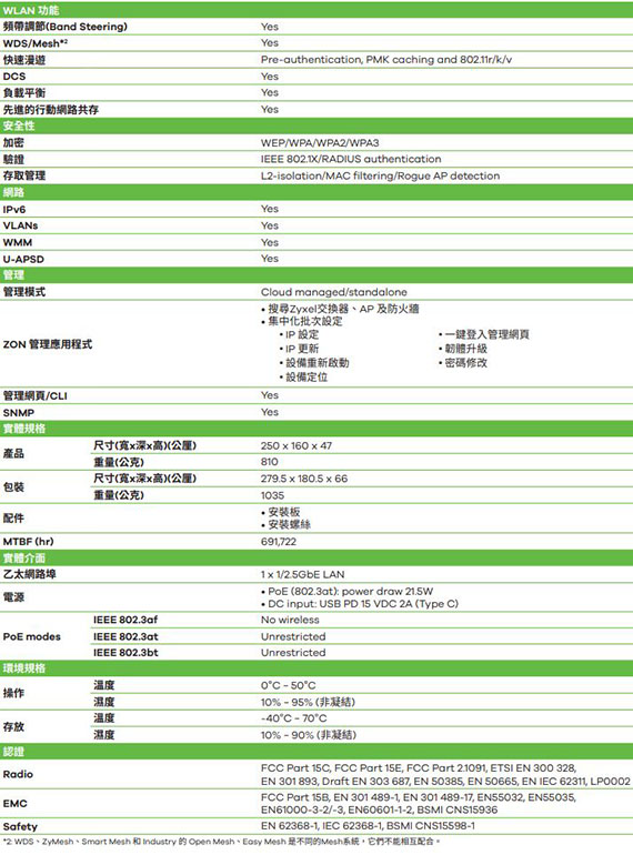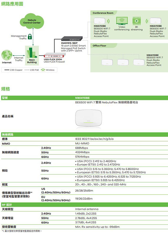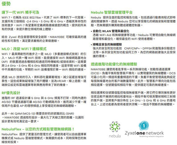 WiFi7 雙頻、傳輸效能高達6.5Gbps、採用Wi-Fi7 Qualcomm處理器、NebulaFlex,彈性選擇單機運作或Nebula雲端平台管理、具備雙頻 (2.4GHz) 2x2+ (5GHz) 4x4 天線、具備Gigabit乙太網路連接埠,具PoE供電技術、提供兩種供電模式PoE及Tyep-C、支援OFDMA與MU-MIMO、支援WPA3加密協議、具備行動電話共存技術、具備16組SSID並支援VLAN、強化雷波突擊、ESD靜電防護及固態電容、三年保固