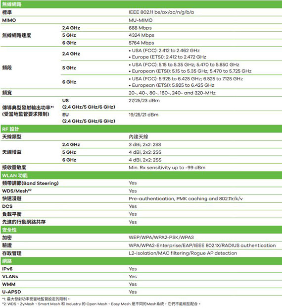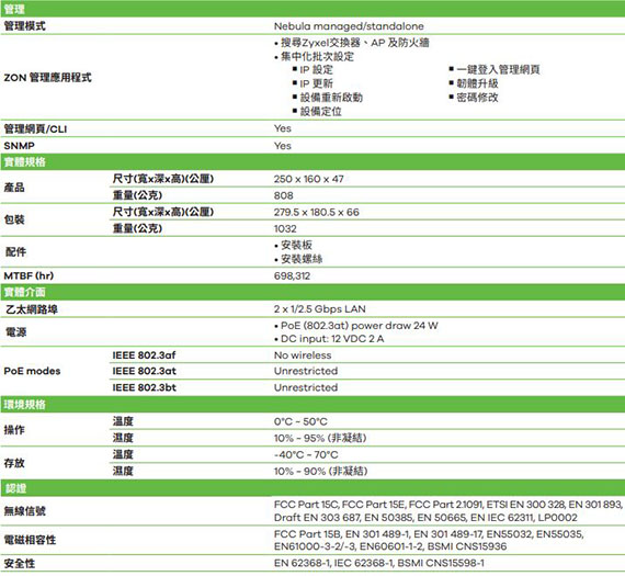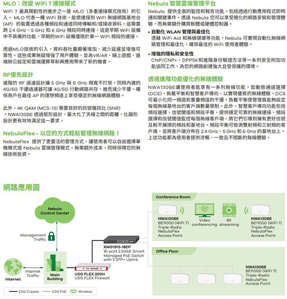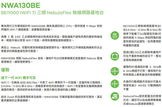 三頻WiFi7、無線傳輸速度高達約11000Mbps、具備2*2.5G乙太網路、進階的RF濾波設計、NebulaFlex雲端管理/單機雙模管理