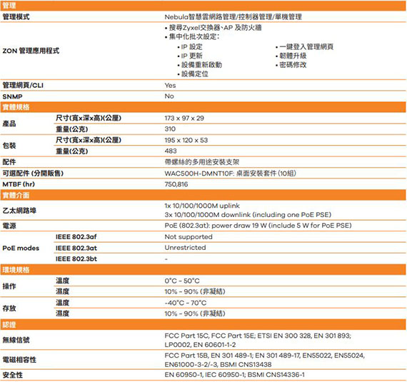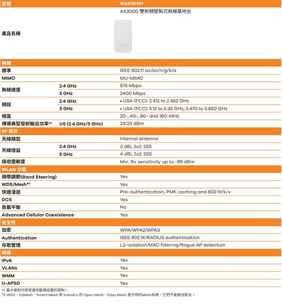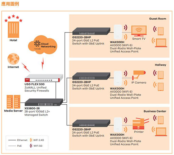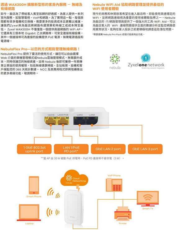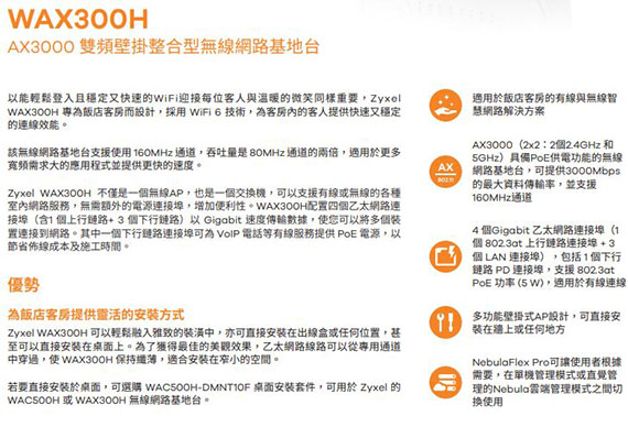 雙頻WiFi6、傳輸速度高達3000Mdps、支援1024AQM 160MHz寬頻、美觀嵌牆式設計、NebulaFlex Pro三模管理、適用飯店客房有線/無線智慧網路解決方案、介面:4*GbE(其中1個支援PoE供電)