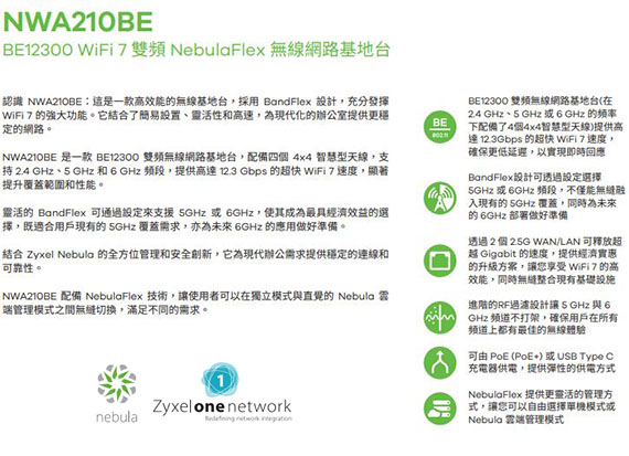 ZYXEL兆勤合勤 NWA210BE BE12300 雙頻 Wi-Fi7 PoE NebulaFlex 無線網路基地台