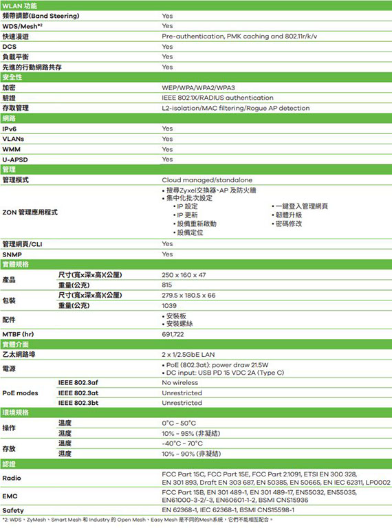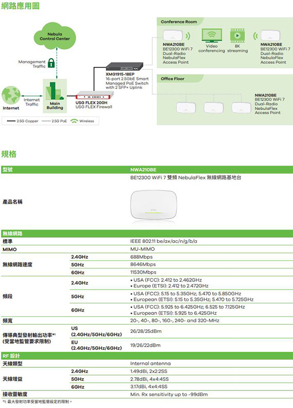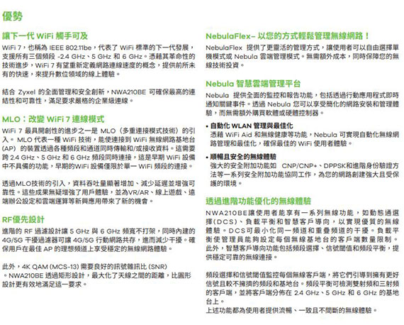 WiFi7 雙頻、傳輸效能高達11Gbps、採用Wi-Fi7 Qualcomm處理器、NebulaFlex,彈性選擇單機運作或Nebula雲端平台管理、具備雙頻 (2.4GHz) 2x2+ (5GHz) 4x4 天線、具備Gigabit乙太網路連接埠,具PoE供電技術、提供兩種供電模式PoE及Tyep-C、支援OFDMA與MU-MIMO、支援WPA3加密協議、具備行動電話共存技術、具備16組SSID並支援VLAN、強化雷波突擊、ESD靜電防護及固態電容、三年保固