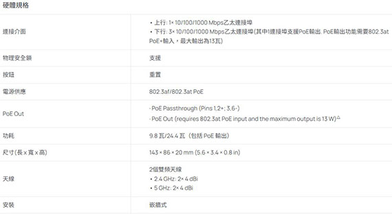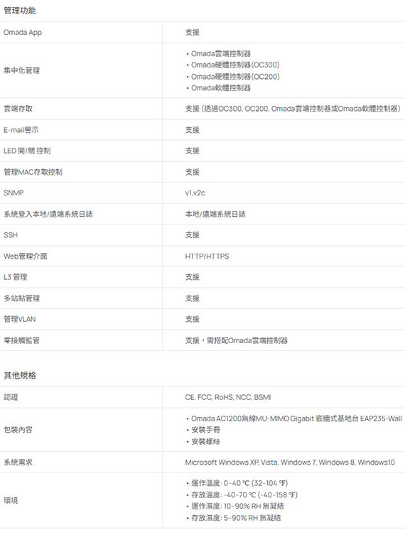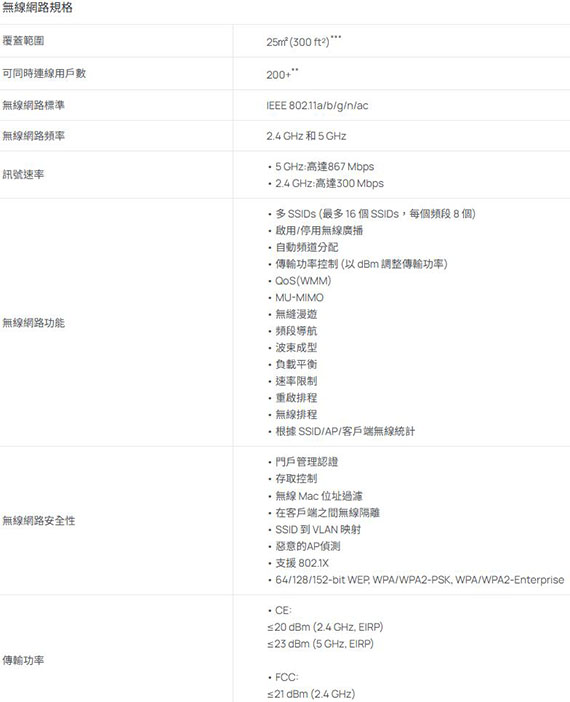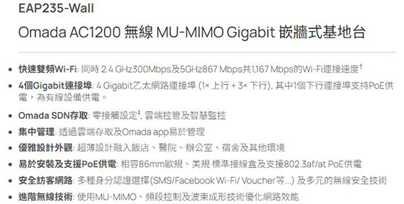 2.4GHz/5GHz雙頻,符合IEEE802.11ac 網路標準,MU-MIMO技術,無線傳輸速率高達1167Mbps(5GHz:867Mbps,2.4GHz:300Mbps),Omada SDN存取,透過雲端存取及Omada app集中管理,支援PoE供電,安全訪客網路,介面:4*10/100/1000 Mbps乙太連接埠(其一支持PoE),尺寸(長x寬x高):143x86x20mm NCC認證碼: CCAH19LP9450T3 BSMI認證碼: D38330