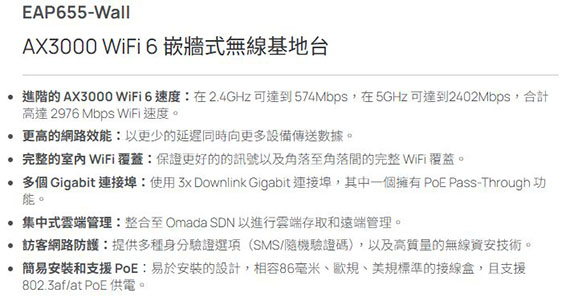 TP-Link EAP655-Wall AX3000 嵌牆式 Wi-Fi6 無線基地台