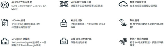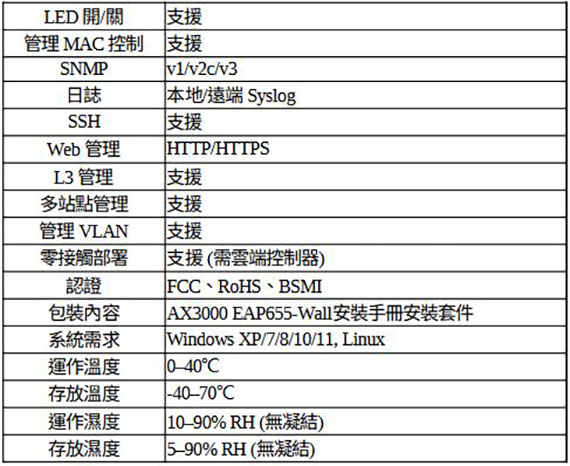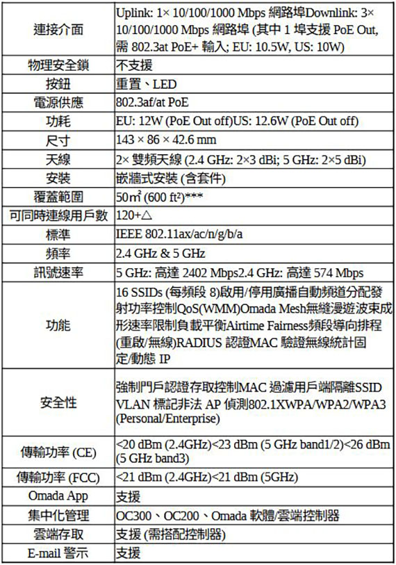 提供1埠(上行)+3埠(下行) 10/100/1000Mbps網路連接埠,其中一個支援802.3af/at PoE供電, 在2.4GHz同時達到574Mbps,在5GHz同時達到2402Mbps,合計高達2976Mbps WiFi速度, 2個雙頻天線, 整合至Omada SDN以進行雲端存取和遠端管理, 訪客網路防護-提供多種身分驗證選項(SMS/Voucher), 嵌牆式安裝(含安裝套件) NCC認證碼: CCAH22LP9400T6 BSMI認證碼: D38330