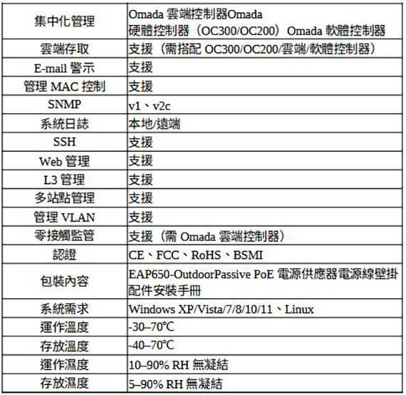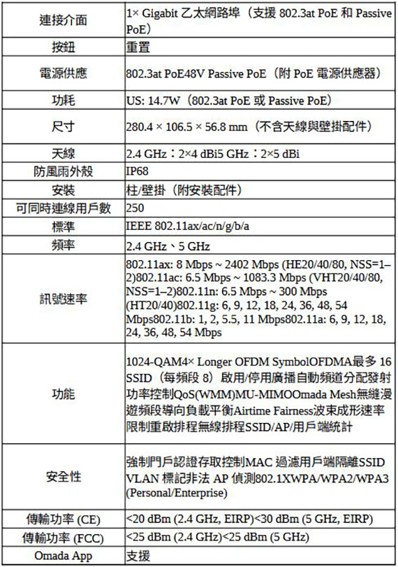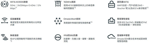 提供1埠Gbps乙太網路孔,支援802.3at PoE+和被動式PoE (包含變壓器)電源, 提供高達3Gbps的雙頻速度, 160MHz頻寬通道, 特製的高功率放大器和專業的天線提供大範圍Wi-Fi覆蓋, OFDMA 和 MU-MIMO 更高的網路效率, Omada Mesh技術AP之間可使用無線延伸覆蓋範圍, 使用者在不同AP的Wi-Fi 範圍內移動時,無縫漫遊可自動切換連線的AP, 整合至Omada SDN,提供本地、雲端存取或Omada app管理整個網路, IP67防水防塵,柱/壁掛(包裝內含安裝配件) NCC認證碼: CCAH23LP1150T3 BSMI認證碼: D38330