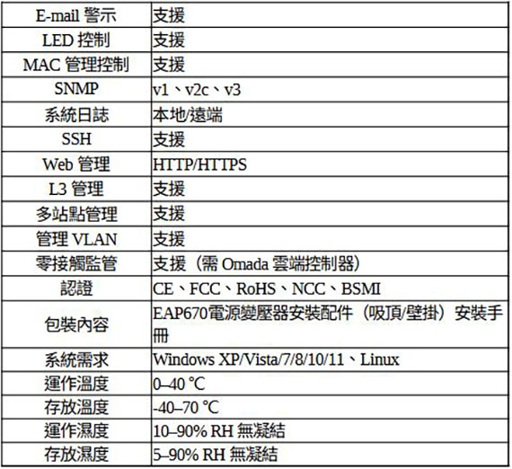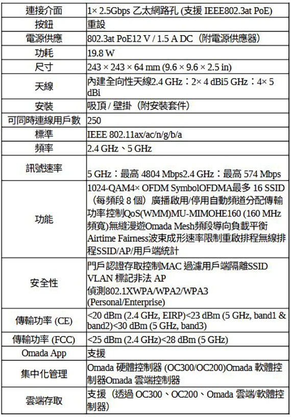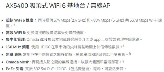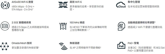 提供1埠2.5Gbps乙太網路,支援802.3at PoE+ 和DC(包括變壓器)電源, 同時提供:574Mbps(2.4 GHz) 和 4804Mbps(5 GHz) 共5378Mbps Wi-Fi速度, 160MHz頻道, 內建全向性天線, Omada SDN集合本地或透過網頁介面或app上從雲端管理整個網路, 當用戶在不同位置之間移動時,影像串流和語音通話不受影響, Omada Mesh實現接入點之間的無線連接, 吸頂/牆上壁掛(內含套件) NCC認證碼: CCAH23LPB810T1 BSMI認證碼: D38330