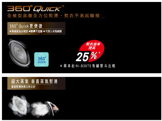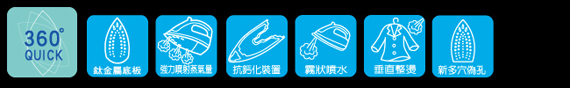 360度QUICK全梭型底盤全方位熨燙,鈦金屬底板,強力噴射蒸汽量,抗鈣化裝置,霧狀噴水,垂直整燙,新多穴偽孔