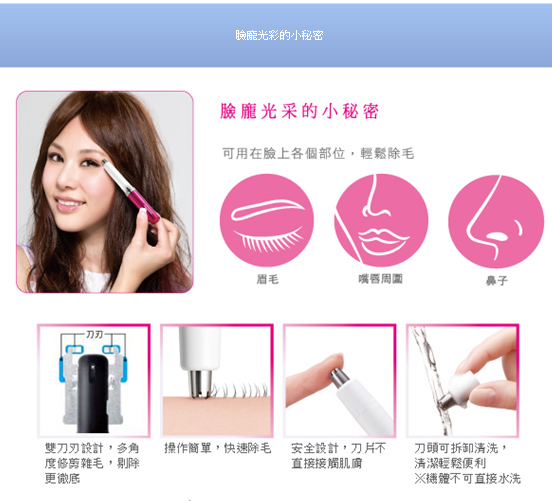 可剔除臉上各個部位雜毛,操作簡單,快速除毛,刀頭可拆卸水洗,不傷肌膚安全設計