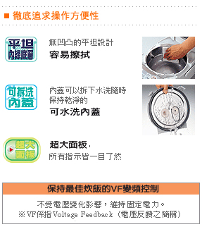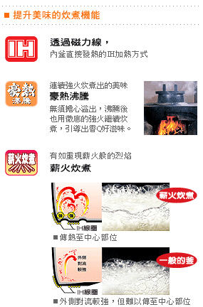 滿水量(容量):3人份,世界首創「真空灶燒內釜」,活性糙米功能,可以炊煮質地較硬的「糙米」與「發芽糙米」,連續高溫「豪熱沸騰」,「薪火炊煮」功能,內蓋可拆可清洗,液晶操作面板,3.3kg