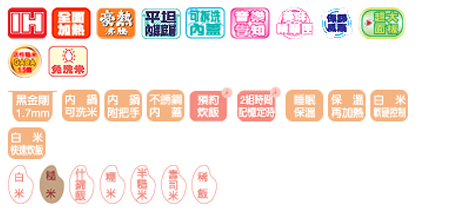 滿水量(容量):10人份,黑金剛1.7mm,內鍋附把手,不鏽鋼內蓋,白米軟硬的控制,內蓋可拆洗,可水洗,豪熱沸騰,液晶操作面板,4.8kg