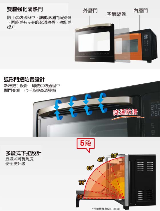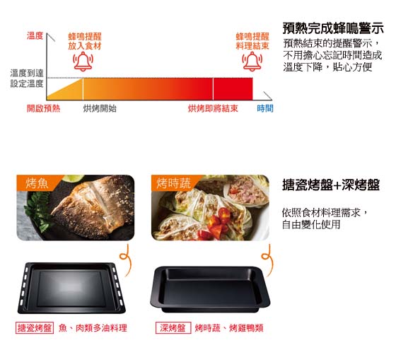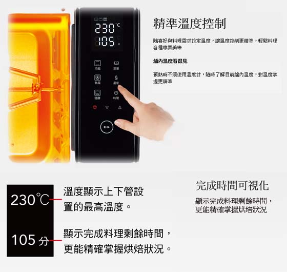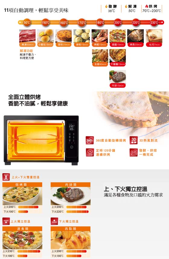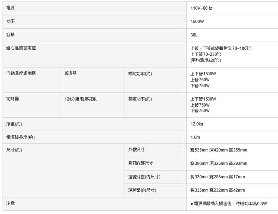 容量38L,微電腦精準控溫,爐內溫度看得到,完成時間可視化, 搪瓷烤盤+深烤盤,雙層強化隔熱門,弧形門把防燙設計,弧形門把防燙設計,尺寸:寬535mm 深420mm 高355mm