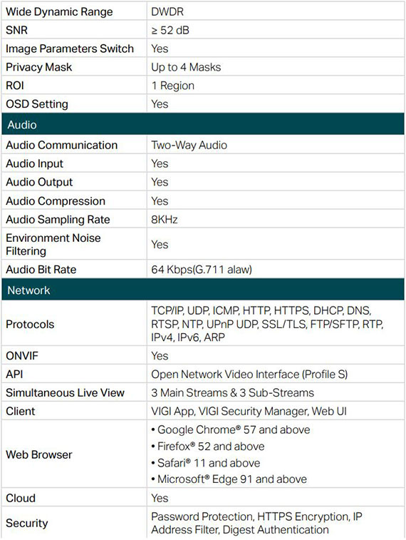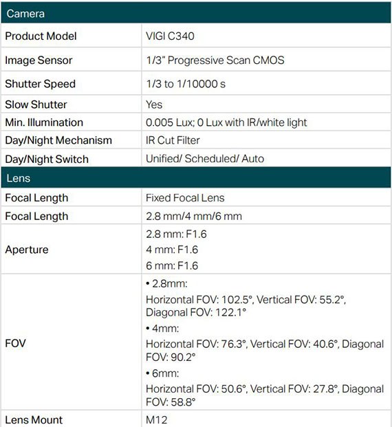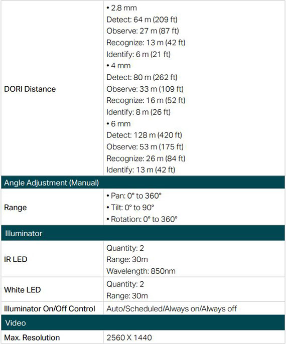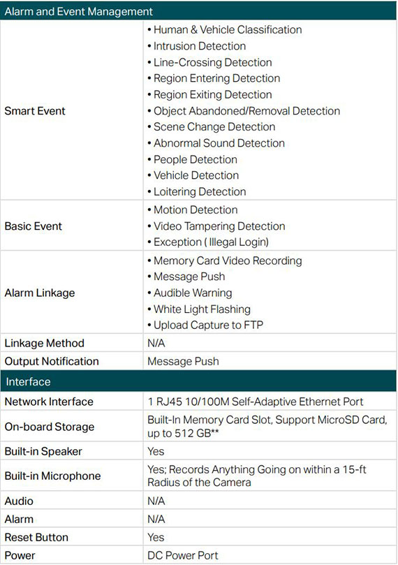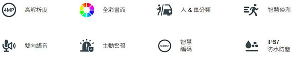 4MP解析度,全彩畫面,1/3逐行掃描 CMOS,30公尺智慧紅外線,固定鏡頭焦距4mm,光圈F1.6,可視角度水平視野: 79°,垂直視野: 43°, 對角線視野: 93°,傳輸介面: 1*RJ45 10/100M乙太網路孔,支援MicroSD卡最高256GB(另購),兩種供電PoE/12V DC,智慧偵測 (人像偵測、移動偵測、越線偵測、區域入侵、鏡頭遮蔽),H.265+ 智慧編碼,遠端監控,雙向語音,寬動態範圍(WDR), IP66防水防塵
