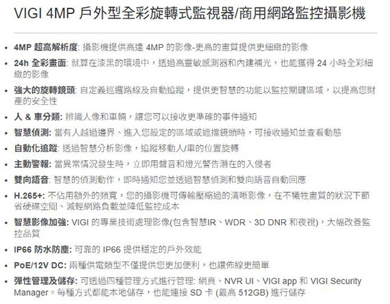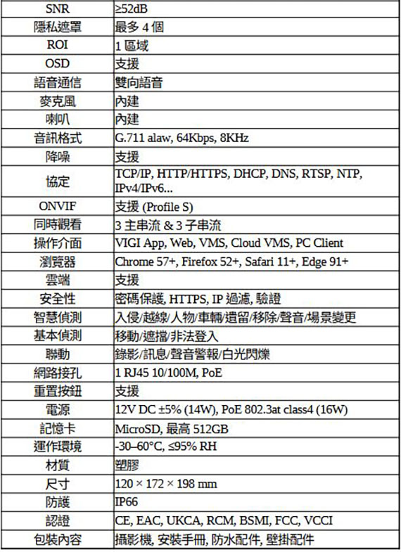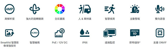 鏡頭焦距4mm,光圈F1.6,1/3”逐行掃描 CMOS,水平視野: 79°, 垂直視野: 43°, 對角線視野: 93°,全彩4MP高解析度,傳輸介面: 網路,支援MicroSD卡最高256GB(另購),寬動態範圍WDR,3D DNR數位降噪,IP66防水防塵等級,智慧偵測 (人像偵測、移動偵測、區域入侵、越線偵測、鏡頭遮蔽),主動警報,遠端監控,雙向語音,H.265+優化影像壓縮