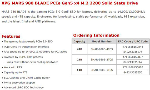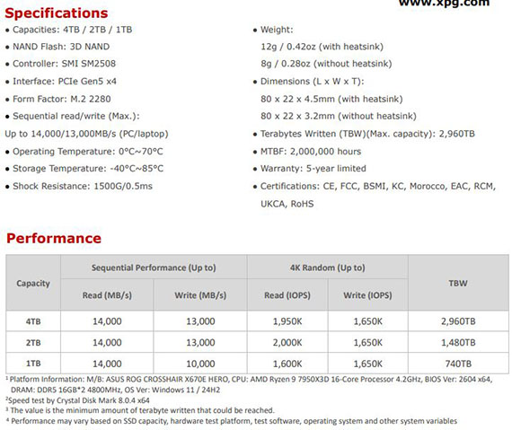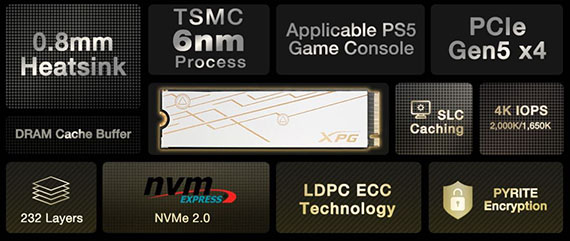 PCIe 5.0 Gen5x4介面,讀取速度高達14,000MB/s,寫入速度高達 10,000MB/s,能安裝在PS5當作擴充硬碟,SMI控制器,採用台積電先進6nm製程,DRAM Cache Buffer,LDPC ECC 除錯機制,隨盒附贈鋁合金散熱片,五年有限保固