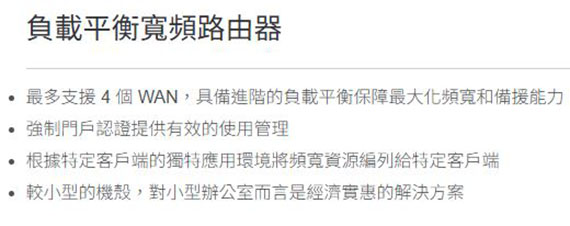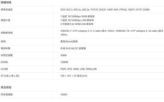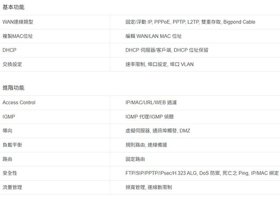 內建5埠,符合5IEEE 802.3、802.3u、802.3x、TCP/IP、DHCP、ICMP、NAT、PPPoE、SNTP、HTTP、DDNS,介面:10/100Mbps RJ45*1(WAN),10/100Mbps RJ45(LAN)*1,可變更RJ45(WAN/LAN)*3,具備進階的負載平衡保障最大化頻寬和備援能力,可以自動偵測和阻止(DoS)攻擊,提供IP / MAC / URL / Web過濾功能,可有效防止入侵者和病毒的攻擊,強制門戶認證 BSMI認證碼: D38330