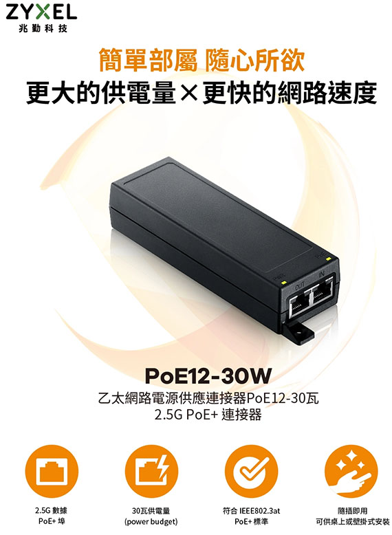 【上一個】【下一個】 | ZYXEL兆勤合勤 PoE12-30W 乙太網路電源供應連接器(促銷價至 11/30 止)