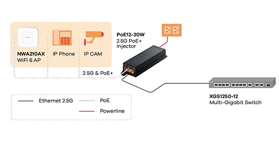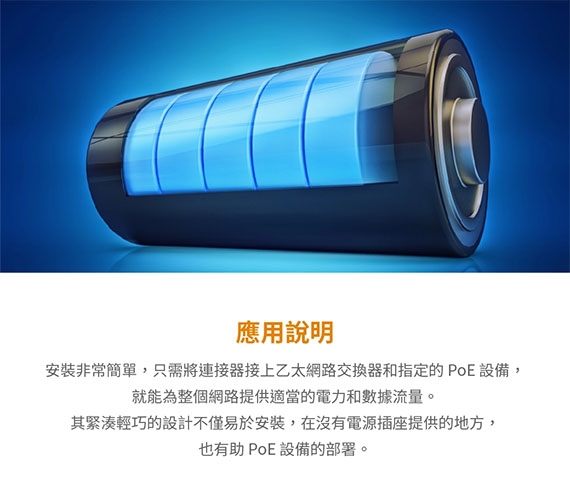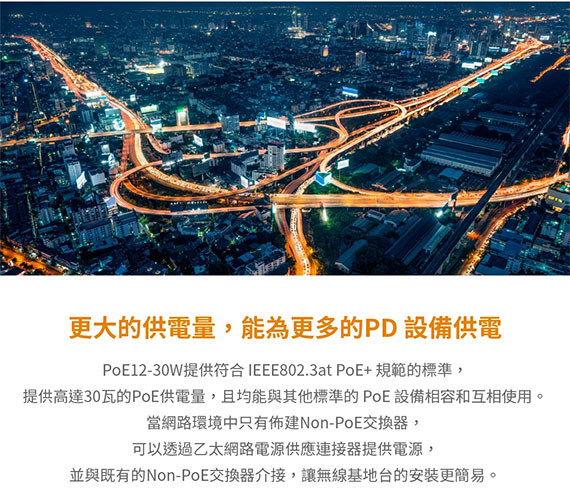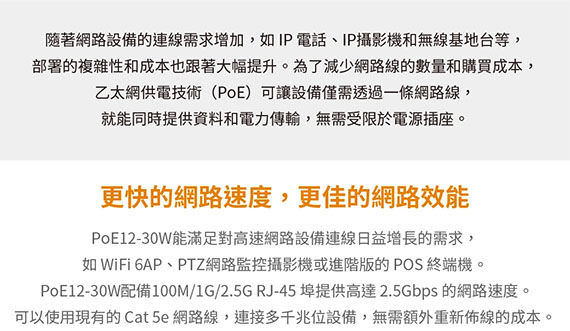 僅需透過一條網路線,便能同時提供資料和電力傳輸,提供2.5GHz的網路速度,30瓦供電量,支援標準802.3at PoE+供電,可使用現有的Cat 5e網路線,無須額外重新佈線成本,操作安裝簡單,隨插即用,可供桌上或壁掛式安裝