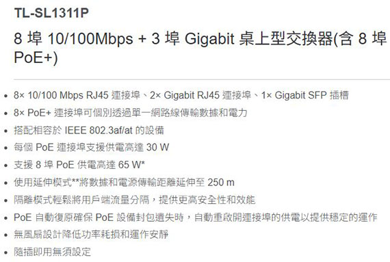 【上一個】【下一個】 | TP-Link TL-SL1311P 8埠 10/100Mbps + 3埠 Gigabit 桌上型交換器