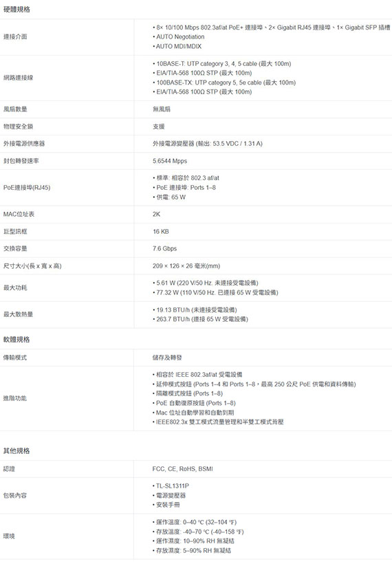 提供 10/100 Mbps RJ45 連接埠*8埠, 10/100/1000Mbps RJ45 Gigabit網路*2埠, Gigabit SFP 光纖*1埠, 8個PoE+連接埠傳輸資料和供電,每個供最高30W, 支援8埠供電高達65W, 延伸模式下可供最高250公尺資料和電力傳輸,相容IEEE 802.3af/at設備, 隔離模式提供一鍵將用戶端流量分離以提高安全性及效能,自動復原功能在PoE受電設備連線不佳或斷線時自動重啟設備,無風扇設計