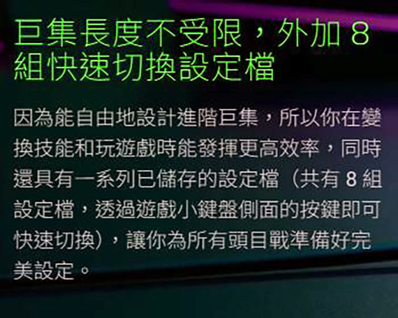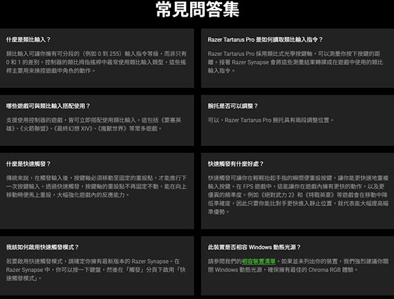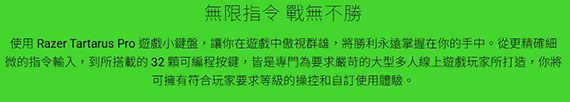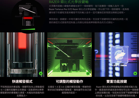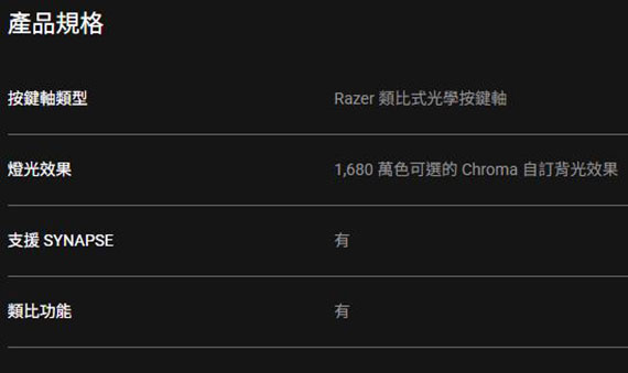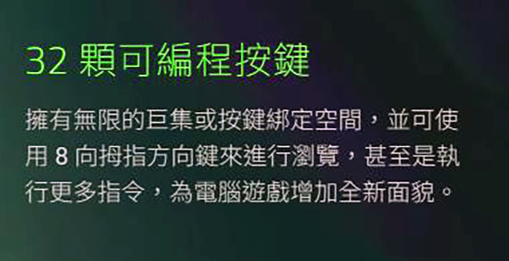 類比式光學按鍵軸:按下同一個按鍵時 能夠根據你按下的鍵程深度來觸發不同的輸入指令,快速觸發模式/可調整的觸發動作/雙重功能按鍵,32 顆可編程按鍵,8向拇指方向鍵,8組快速切換設定檔,1,680 萬色可選的 Chroma 自訂背光效果,支援 Synapse,腕托具有兩段調整位置