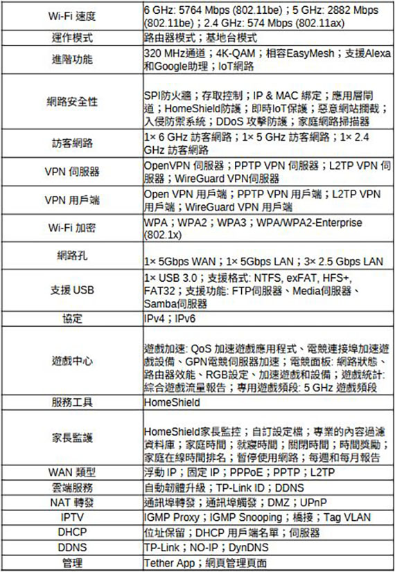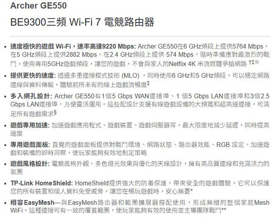 三頻WiFi 7、網路速度高達9220Mbps、多重連接模式技術 (MLO)、遊戲專用加速、專用遊戲面板、RGB炫彩光效、TP-Link HomeShield、相容EasyMesh、介面:1*5Gbps(WAN)、1*5Gbps(LAN)、3*2.5Gbps(LAN)