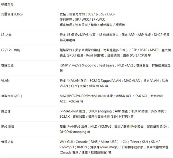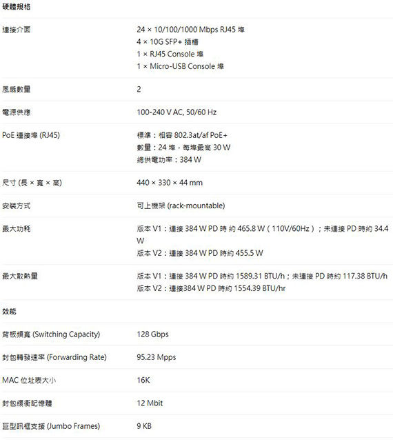 提供24*10/100/1000 Mbps RJ45,4*Gigabit SFP+,1*RJ45 Console,1*Micro-USB Console,24個PoE+供電384W(每埠最高30W),Omada SDN集中雲端管理和智慧監控,提供IP-MAC-Port綁定、ACL、Port Security、DoS防禦、風暴控制、DHCP Snooping、802.1X, Radius驗證等..進階安全管理功能,靜態路由、IGMP Snooping、802.1Q VLAN功能,風扇*2,可上機架,尺寸:440x330x44mm,三年保固