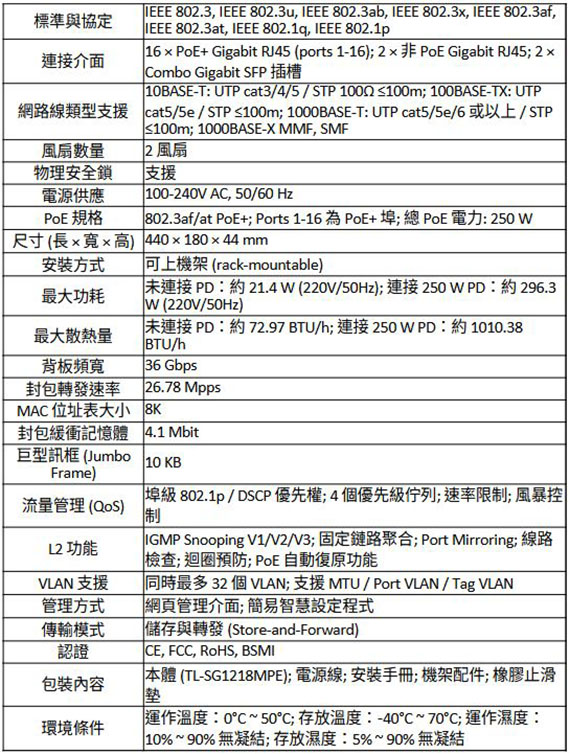 提供16*10/100/1000Mbps RJ45(含PoE+),2*10/100/1000Mbps RJ45,2*Combo Gigabit SFP,每埠可供30W/PoE總供電最高可達250W,智慧的電量管理保護交換器不過載,QoS提供流量優先級,IGMP Snooping 提供群播優化,風扇*2,可上機架,尺寸440x180x44mm