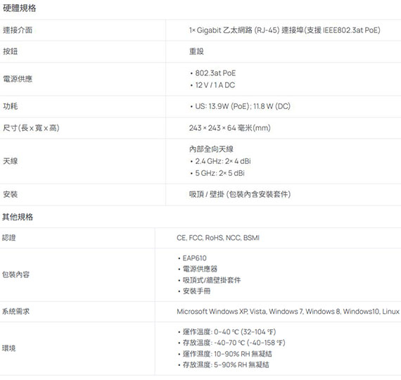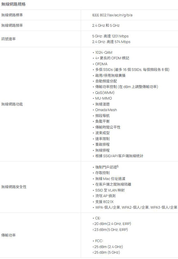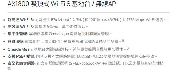 2.4GHz/5GHz雙頻,新6代WiFi標準802.11ax技術,無線網路速度1775Mbps(2.4GHz 574Mbps+5GHz 1201Mbps),集中雲端管理,Omada Mesh技術,無縫漫遊,支援 PoE+供電,安全的訪客網路,支援Gigabit乙太網路孔*1,內建全向性天線,尺寸:160x160x33.6mm,保固三年 NCC認證碼: CCAH23LP1480T1 BSMI認證碼: D38330