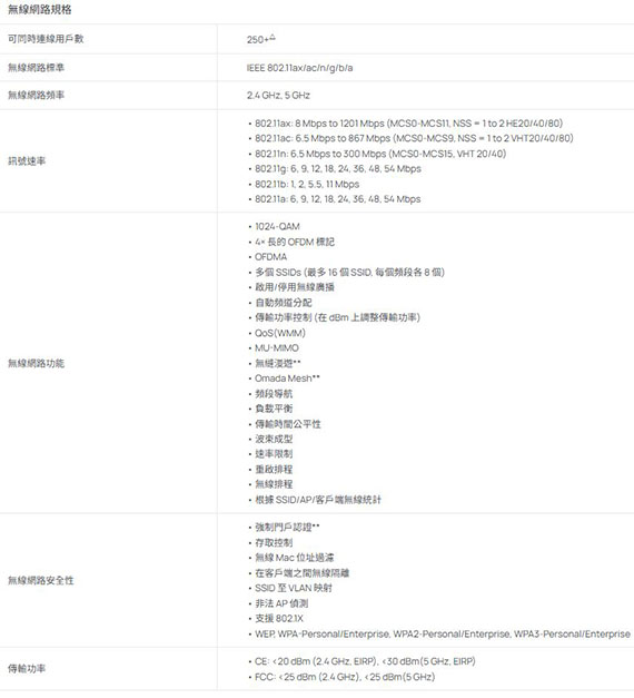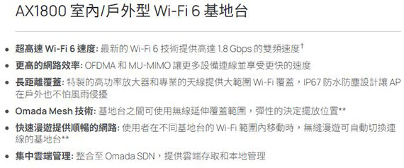 2.4GHz/5GHz雙頻高達 1.8,新6代WiFi標準802.11ax技術,無線網路速度高達約1.8Gbps,集中式雲管理,OFDMA和MU-MIMO技術減少延遲並連接眾多設備,遠距離覆蓋,Omada Mesh技術無線連接,IP67 防水外殼,支援Gigabit乙太網路孔*1,尺寸:280.4x106.5x56.8mm,保固三年 NCC認證碼: CCAR21LP2150T1 BSMI認證碼: D38330