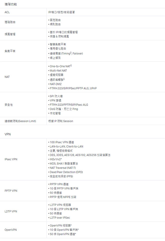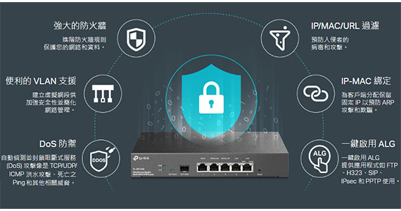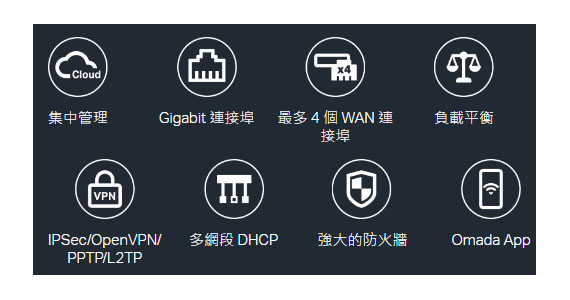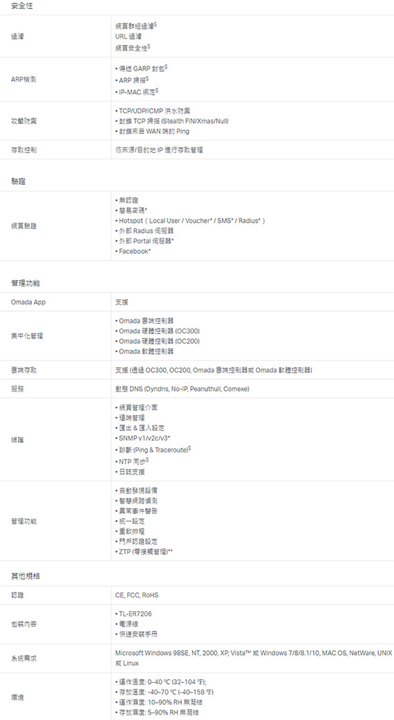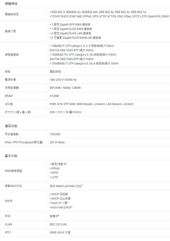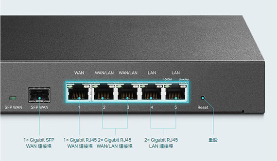 符合 IEEE 802.3 標準,介面:1*固定 Gigabit SFP WAN 連接埠,1*固定 Gigabit RJ45 WAN 連接埠,2*固定 Gigabit RJ45 LAN 連接埠,2*可變更 Gigabit RJ45 WAN/LAN 連接埠,整合的 Omada SDN,集中化管理,高安全 VPN,豐富的安全功能,保固三年