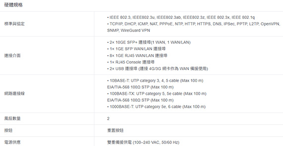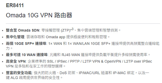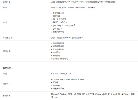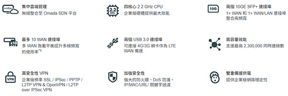 介面:2*10GE SFP+(WAN+WAN/LAN),1*1GE SFP WAN/LAN,8*1GE RJ45 WAN/LAN,2*RJ45 Console,2*USB3.0,整合的 Omada SDN(需要搭配 OC300、OC200、Omada 雲端控制器或 Omada 軟體控制器),集中化管理,高安全 VPN,豐富的安全功能,保固三年 BSMI認證碼: D38330