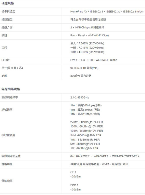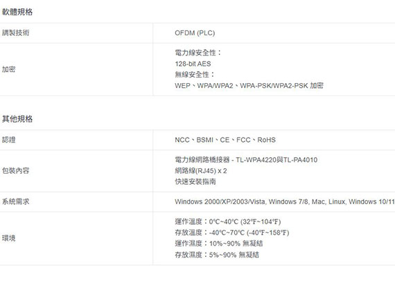 HomePlug AV3標準,提供快速電力線傳輸最高600Mbps,範圍可達300公尺隨插即用,一鍵設定Wi-Fi,Wi-Fi自動同步,強大的Web介面+tpPLC app輕鬆管理,介面:2*乙太網路連接埠,連接TL-PA4010至您的路由器,將TL-WPA4220插入任何您需要有線和無線網際網路服務的設備附近,請注意:電力線網路橋接器是無法單獨使用的,必須2個以上才可運作。 NCC認證碼: CCAF20LP1940T1 BSMI認證碼: D38330